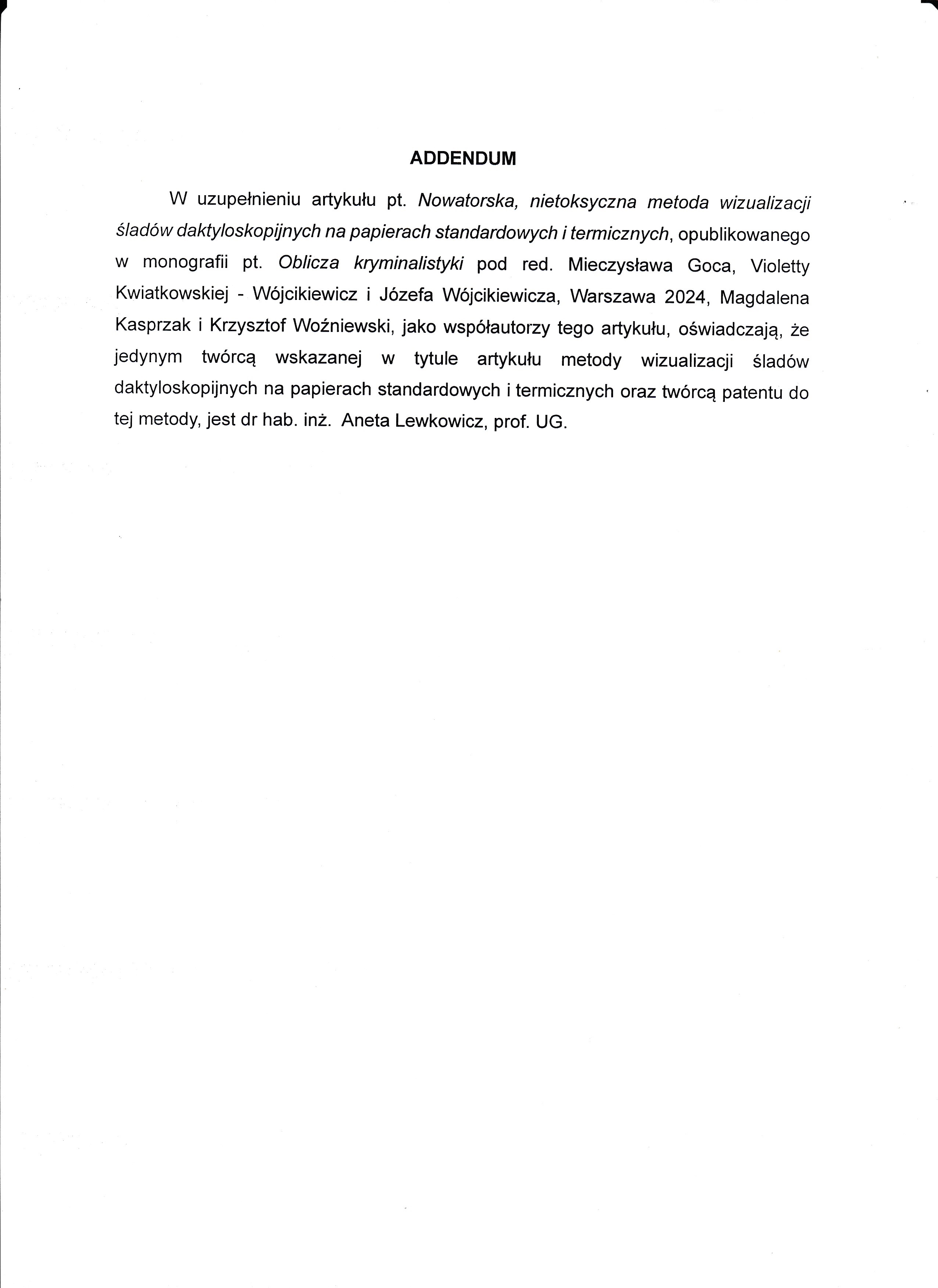 Magdalena Kasprzak i Krzysztof Woźniewski, jako współautorzy tego artykułu, oświadczają, że jedynym twórcą wskazanej w tytule artykułu metody wizualizacji śladów daktyloskopijnych na papierach standardowych i termicznych oraz twórcą patentu do tej metody jest dr hab. inż. Aneta Lewkowicz, prof. UG.