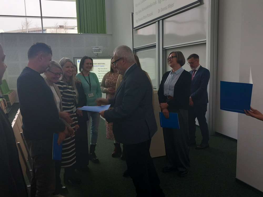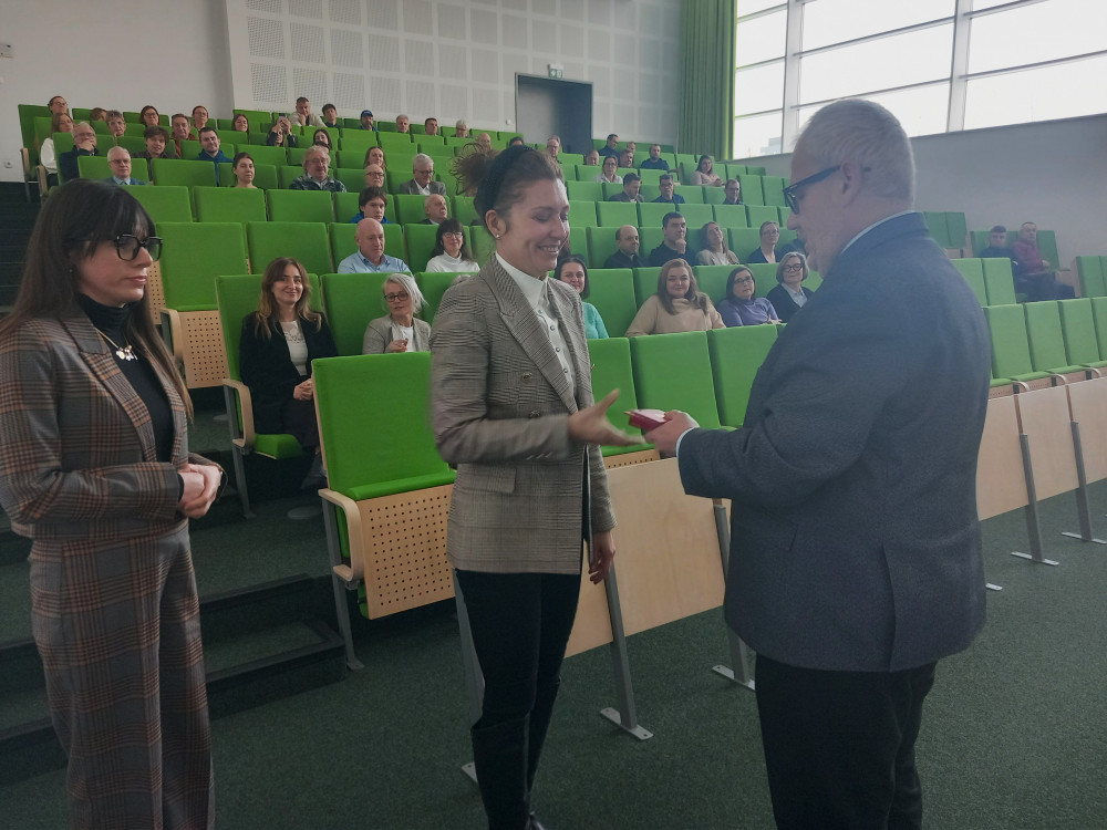 Podkreślona została również rola Zespołu Administracyjnego, któremu zawdzięczamy ciężką i sumienną pracę podczas organizacji remontu rozpoczętego w roku 2025. Oficjalne podziękowanie zostało wręczone pani mgr Marzenie Dronszkowskiej, administratorce budynku WMFiI.